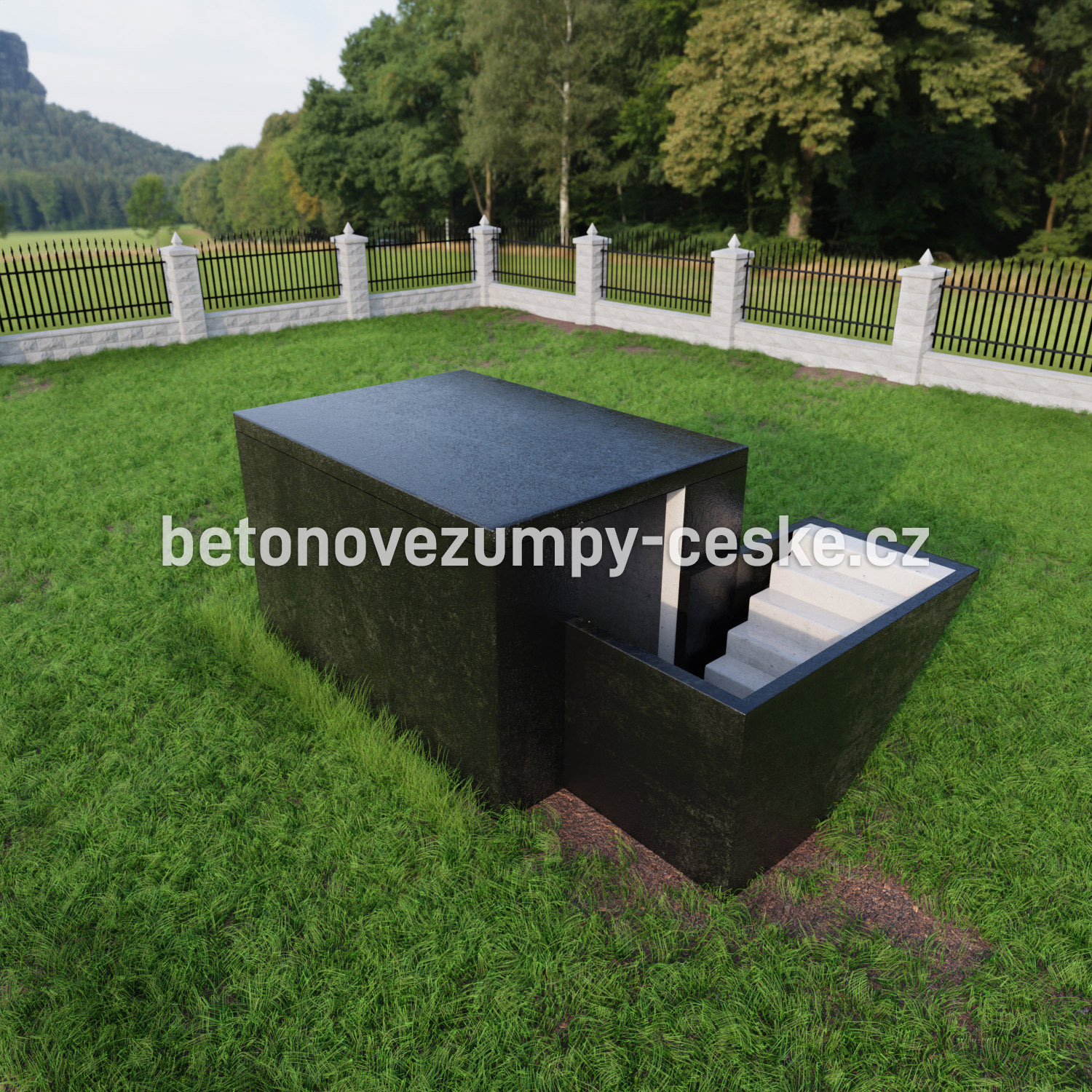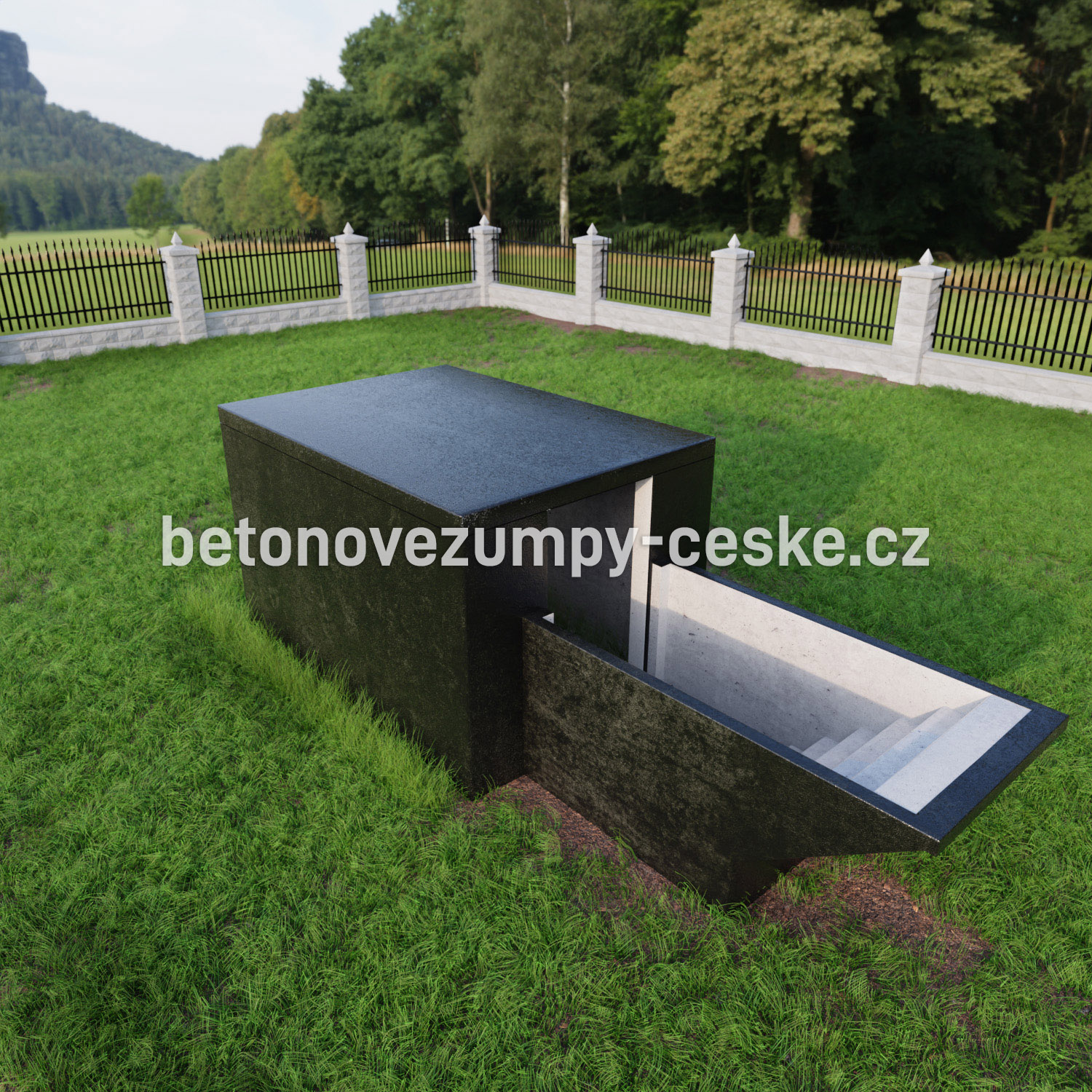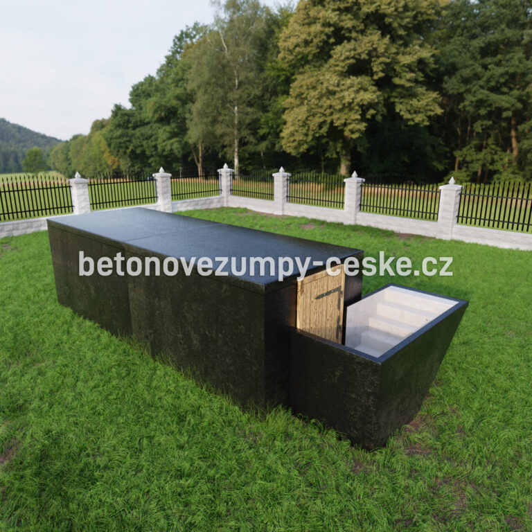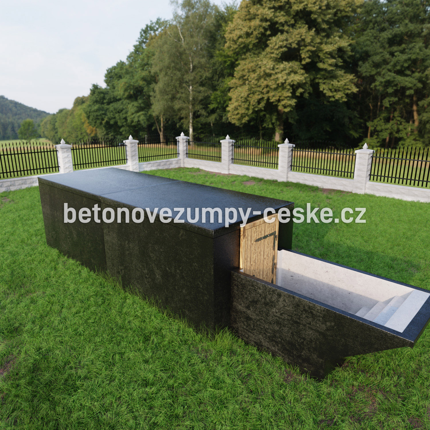 Prefabrikovaný betonový sklep s bočním vstupem a rovnou střechou lze snadno přizpůsobit různým typům pozemků. Díky přímému vstupu je oblíbený zejména tam, kde je kladen důraz na pohodlnou obsluhu a bezbariérový přístup.